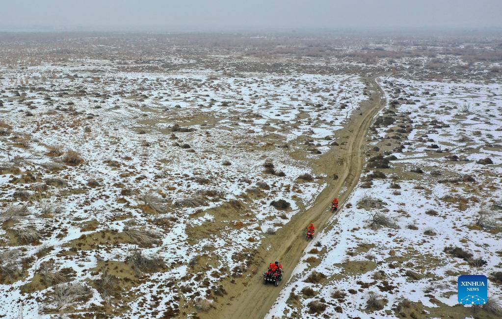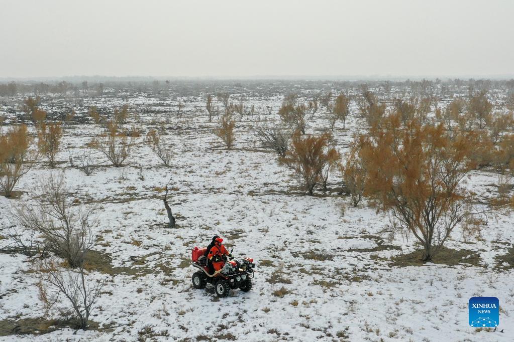 Staff members patrol the Ganjia Lake forest region in Wusu City of northwest China's Xinjiang Uygur Autonomous Region, Dec. 4, 2021. As winter approaches, authorities have been paying more attention to forest fire prevention in the Ganjia Lake forest region in the west of Junggar Basin. Forest rangers have also stepped up their patrolling efforts. In the Ganjia Lake forest region, there are 18 forest management and protection stations that are responsible for forest fireproofing, management of forest resources and grassland and wild animal protection. With improved transportation, staff members can now monitor a considerably larger area of woodland. The Ganjia Lake forest region, with an area of roughly 3,920,000 mu (about 2613.3 square kilometers) and over 110 plant species, serves as an important ecological protective screen for preventing land desertification. (Xinhua/Bai Zhiqiang)