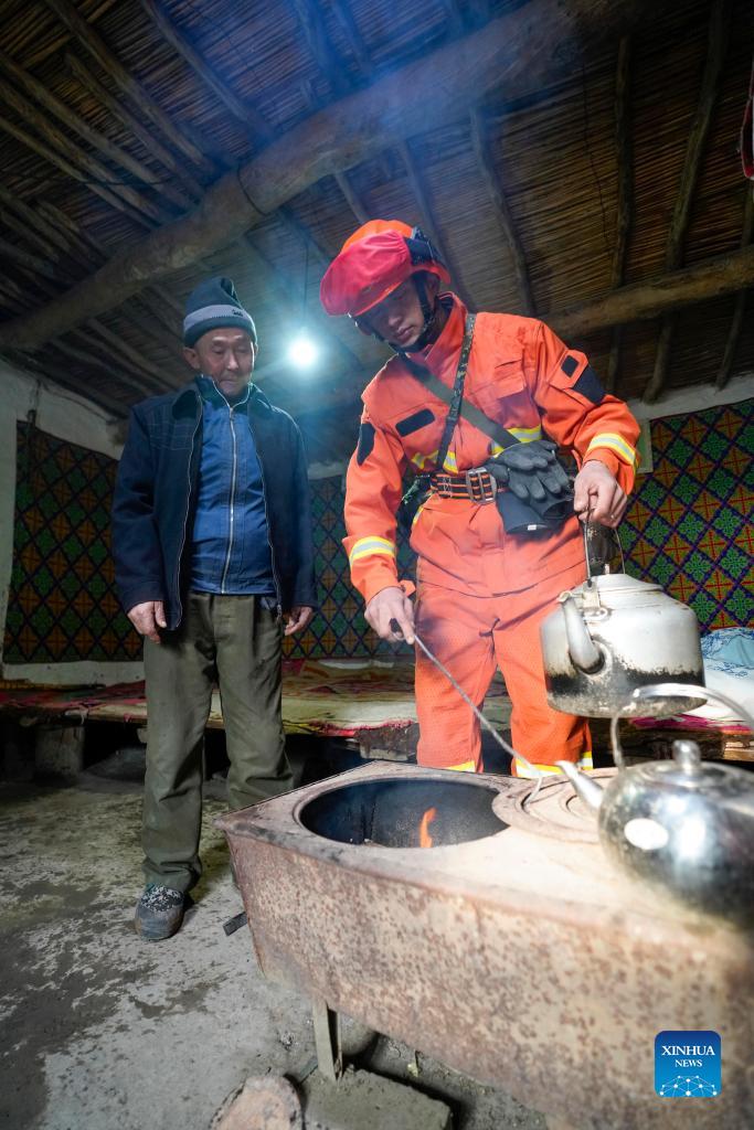 A member (R) from an emergency handling team of the Ganjia Lake forest region explains to a villager on preventing fire from spreading out in Mafangzi Village of Wusu City, northwest China's Xinjiang Uygur Autonomous Region, Dec. 4, 2021. As winter approaches, authorities have been paying more attention to forest fire prevention in the Ganjia Lake forest region in the west of Junggar Basin. Forest rangers have also stepped up their patrolling efforts. In the Ganjia Lake forest region, there are 18 forest management and protection stations that are responsible for forest fireproofing, management of forest resources and grassland and wild animal protection. With improved transportation, staff members can now monitor a considerably larger area of woodland. The Ganjia Lake forest region, with an area of roughly 3,920,000 mu (about 2613.3 square kilometers) and over 110 plant species, serves as an important ecological protective screen for preventing land desertification. (Xinhua/Zhao Ge)