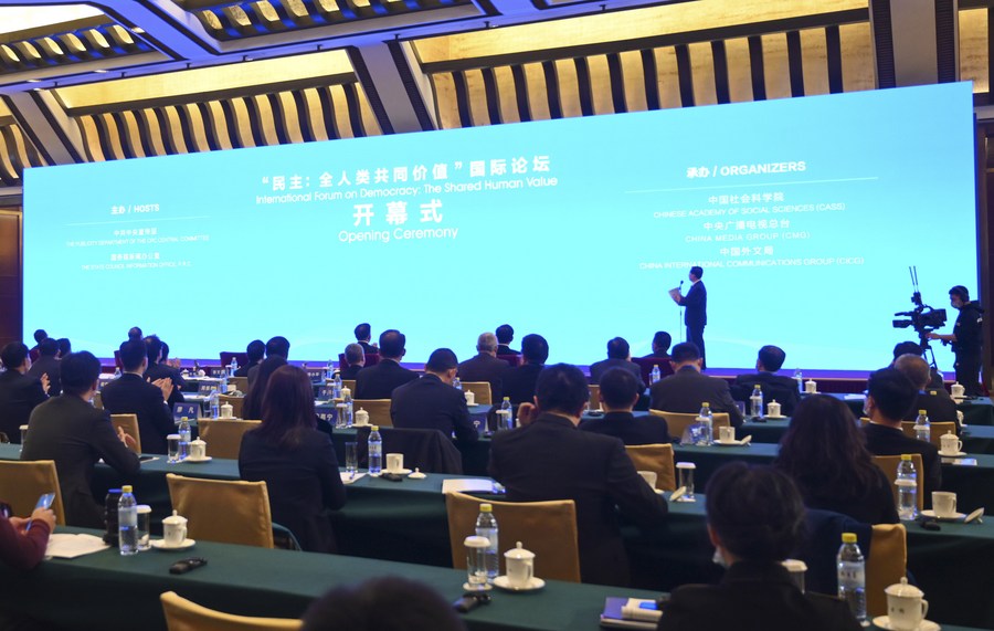 Photo taken on Dec. 4, 2021 shows the opening ceremony of the International Forum on Democracy: The Shared Human Value, in Beijing. (Xinhua/Chen Yehua)