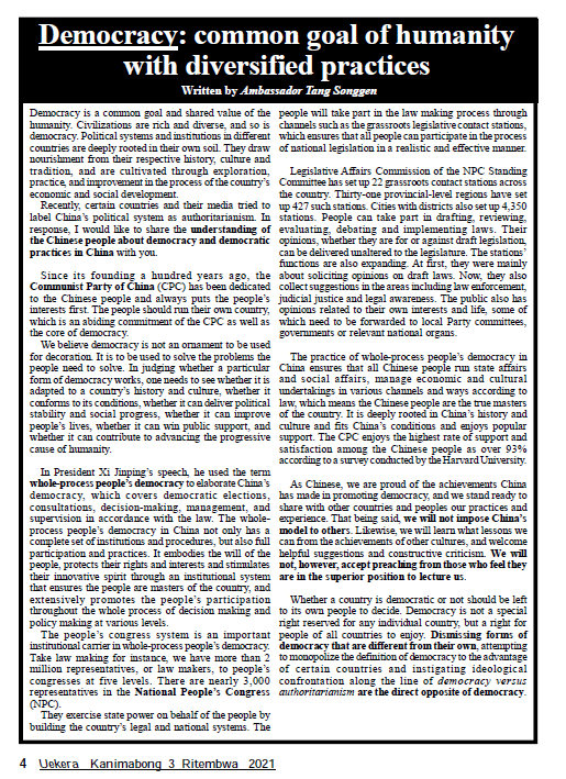 On 3rd December, Ambassador Tang Songgen published an article entitled "Democracy: common goal of humanity with diversified practices" on Kiribati newspapers Uekera and Newstar. The full text of the article is as follow: