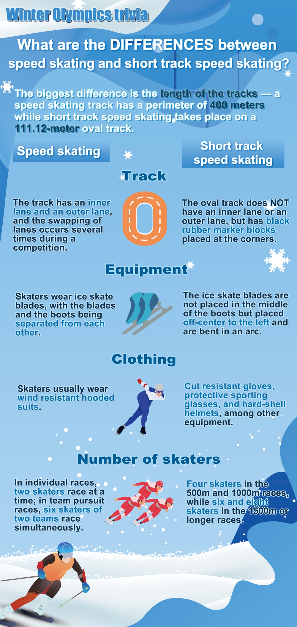 The biggest difference between speed skating and short track speed skating is the length of the tracks—a speed skating track has a perimeter of 400 meters while short track speed skating takes place on a 111.12-meter oval track.