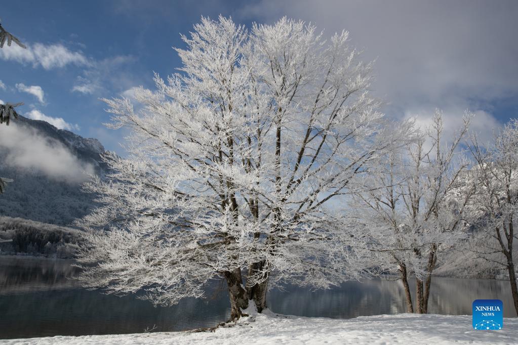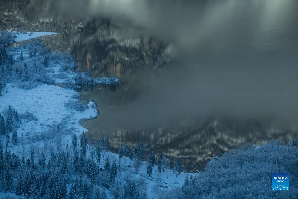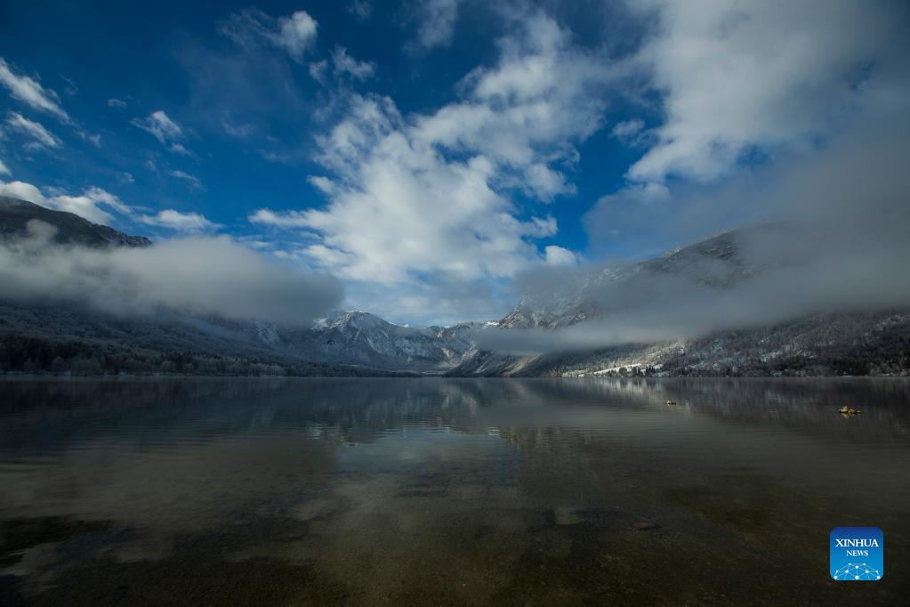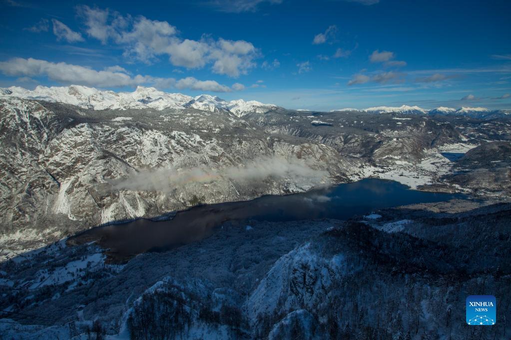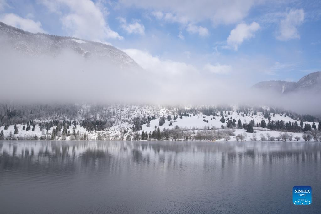Photo taken on Dec. 7, 2021 shows the winter landscape of Lake Bohinj in Triglav National Park, Slovenia. (Photo by Zeljko Stevanic/Xinhua)