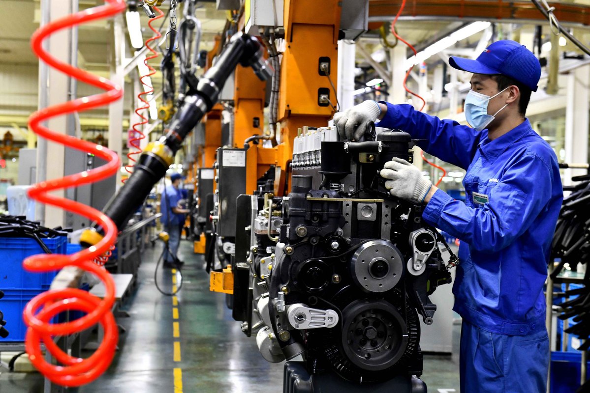 Workers assemble engines at a factory in Weifang, Shandong province, on Dec 6, 2021. [Photo/Xinhua]