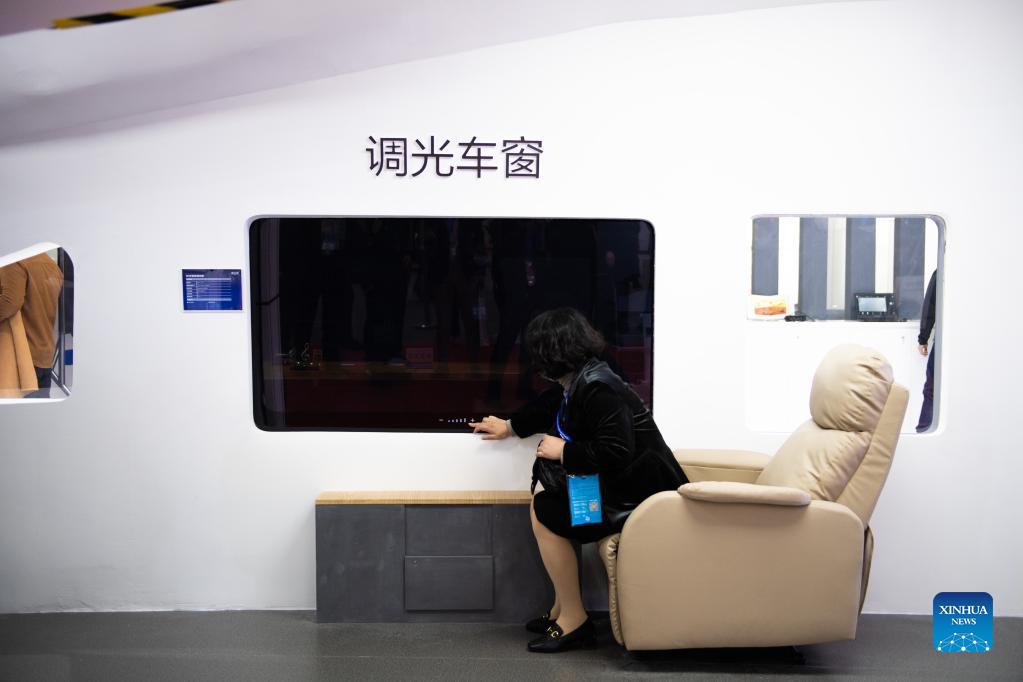 A woman views the exhibits at China International Rail Transit and Equipment Manufacturing Industry Exposition in Zhuzhou, central China's Hunan Province, Dec. 8, 2021. The expo kicked off here on Wednesday. (Xinhua/Chen Sihan)