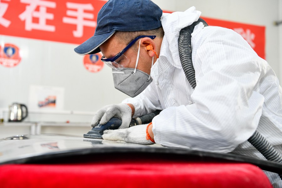 A competitor participates in the contest of automotive painting during a vocational skills competition in Longli County, southwest China's Guizhou Province, Nov. 23, 2021. (Xinhua/Yang Wenbin)