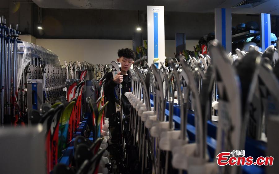 A staff member selects skis for tourists at Thaiwoo Ski Resort in Chongli district of Zhangjiakou city, north China's Hebei Province, Dec. 8, 2021. With the Beijing 2022 Winter Olympics drawing near, more and more people are coming to Zhangjiakou to experience skiing and other winter sports. (Photo: China News Service/Han Bing)