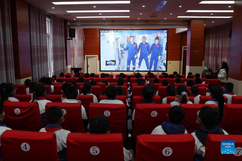 Students attend a live class given by the Shenzhou-13 crew members, in Kangxian County, northwest China's Gansu Province, Dec. 9, 2021. The first live class from China's space station was held on Thursday afternoon, given by Shenzhou-13 crew members Zhai Zhigang, Wang Yaping and Ye Guangfu to students on Earth. (Xinhua/Chen Bin)