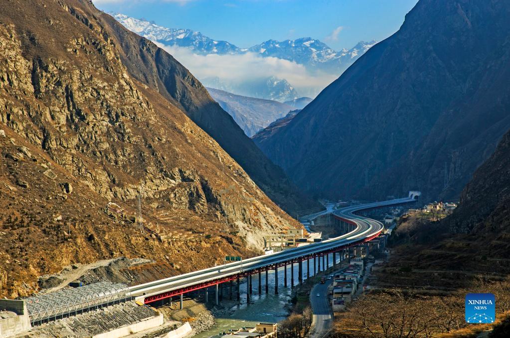 Aerial photo taken on Jan. 1, 2019 shows Keku Bridge on Wenchuan-Ma'erkang expressway in southwest China's Sichuan Province. A series of "Super Projects" in Sichuan have been built to promote the development of western China, making contributions to local economic and social development. (Xinhua)