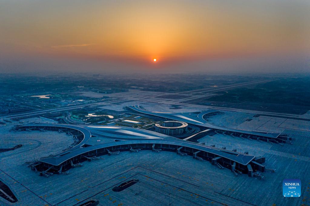 Aerial photo taken on May 7, 2021 shows the Chengdu Tianfu International Airport in southwest China's Sichuan Province. A series of "Super Projects" in Sichuan have been built to promote the development of western China, making contributions to local economic and social development. (Photo by Wang Ruilin/Xinhua)