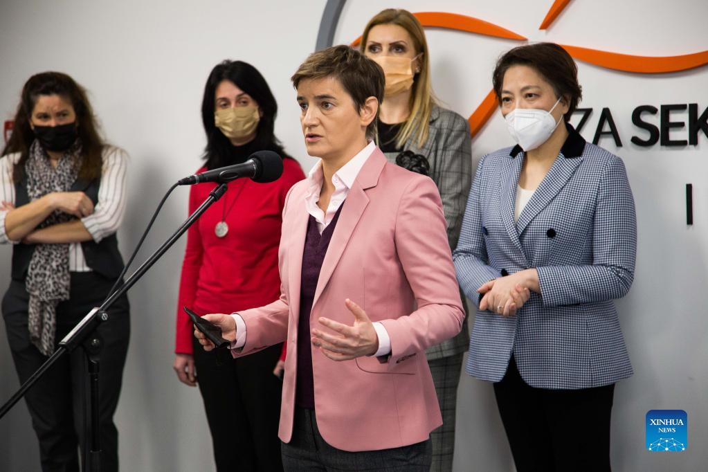 Serbian Prime Minister Ana Brnabic (Front) addresses the opening ceremony of a center for genome sequencing in Belgrade, Serbia, on Dec. 9, 2021. The center for genome sequencing that will help Serbia fight against coronavirus was opened in Belgrade on Thursday. (Xinhua/Shi Zhongyu)