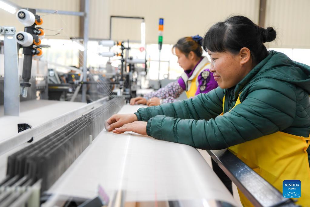 Workers arrange silks on the loom at a "pairing assistance" workshop in Xincheng County, south China's Guangxi Zhuang Autonomous Region, Dec. 8, 2021. Xinyi City, Gaozhou City and Huazhou City of south China's Guangdong Province has further deepened the communication this year with Xincheng County of Guangxi under "pairing assistance" program for rural revitalization. The program focuses on the fields such as development of characteristic industries based on local conditions, education, medical and health care and employment. (Xinhua/Cao Yiming)
