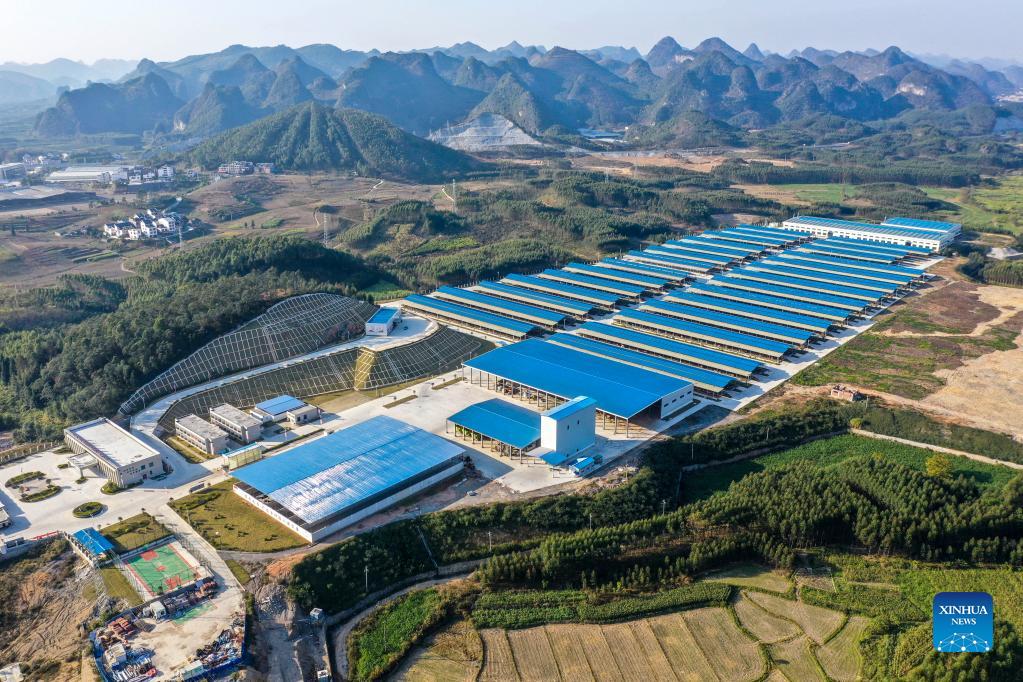 Aerial photo taken on Dec. 8, 2021 shows a cattle breeding base constructed under "pairing assistance" program in Xincheng County, south China's Guangxi Zhuang Autonomous Region. Xinyi City, Gaozhou City and Huazhou City of south China's Guangdong Province has further deepened the communication this year with Xincheng County of Guangxi under "pairing assistance" program for rural revitalization. The program focuses on the fields such as development of characteristic industries based on local conditions, education, medical and health care and employment. (Xinhua/Cao Yiming)