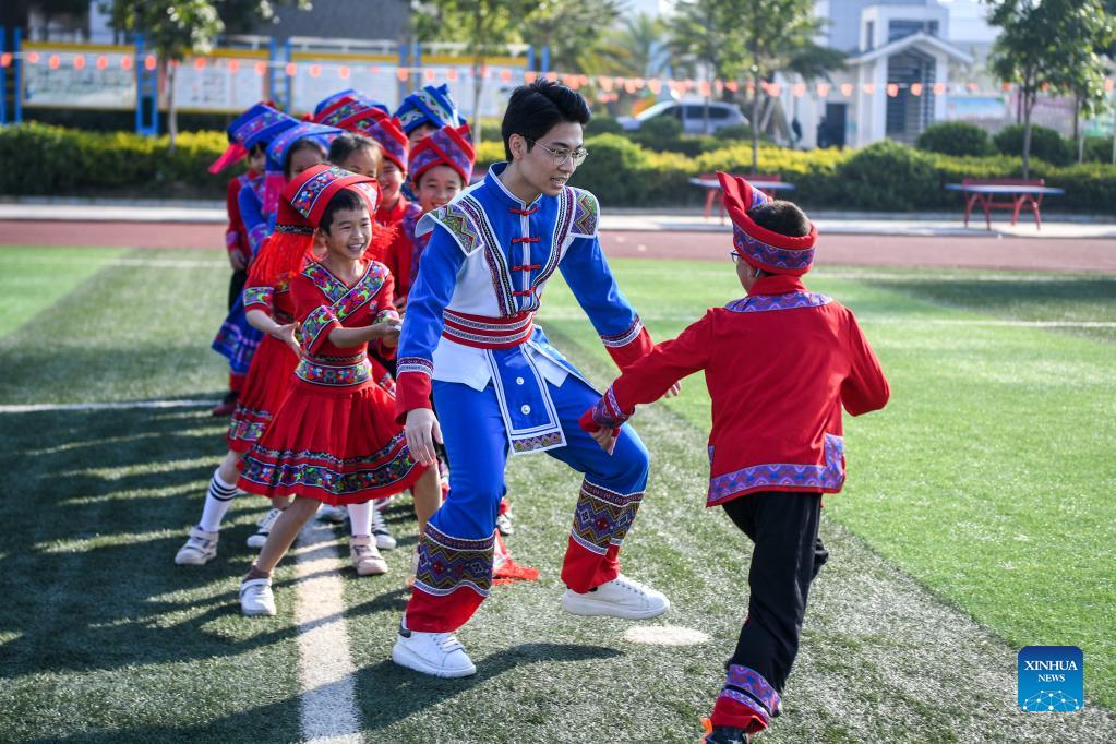 Deng Jiatian (2rd R), a teacher from south China's Guangdong Province, plays with local students at a primary school in Xincheng County, south China's Guangxi Zhuang Autonomous Region, Dec. 8, 2021. Xinyi City, Gaozhou City and Huazhou City of south China's Guangdong Province has further deepened the communication this year with Xincheng County of Guangxi under "pairing assistance" program for rural revitalization. The program focuses on the fields such as development of characteristic industries based on local conditions, education, medical and health care and employment. (Xinhua/Cao Yiming)