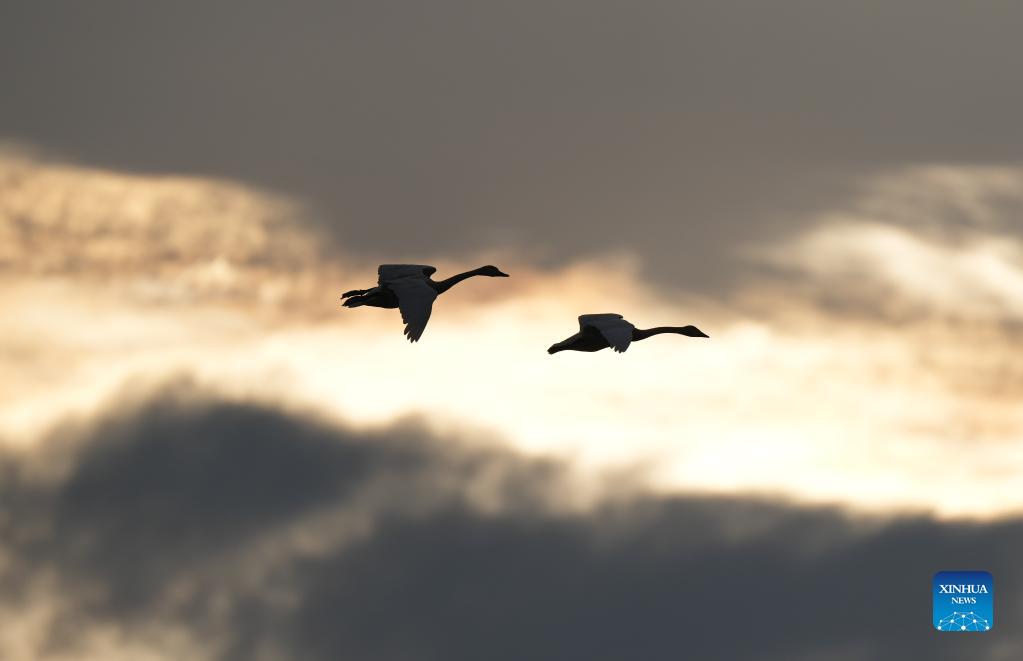 Swans fly over the Wuxing white crane conservation area by the Poyang Lake in Nanchang, east China's Jiangxi Province, Dec. 8, 2021. Numerous migratory birds including white cranes and swans have arrived in the wetland by the Poyang Lake, taking it as their winter habitat. (Xinhua/Zhou Mi)
