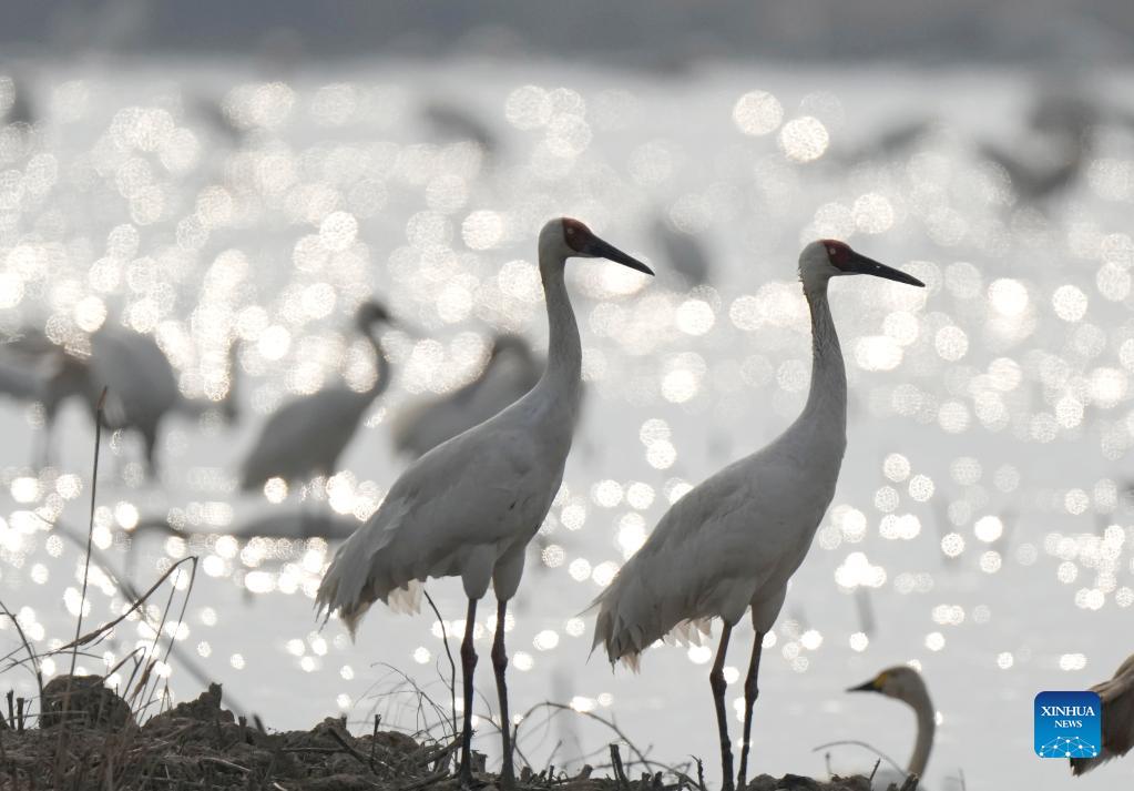 White cranes are seen at the Wuxing white crane conservation area by the Poyang Lake in Nanchang, east China's Jiangxi Province, Dec. 8, 2021. Numerous migratory birds including white cranes and swans have arrived in the wetland by the Poyang Lake, taking it as their winter habitat. (Xinhua/Zhou Mi)