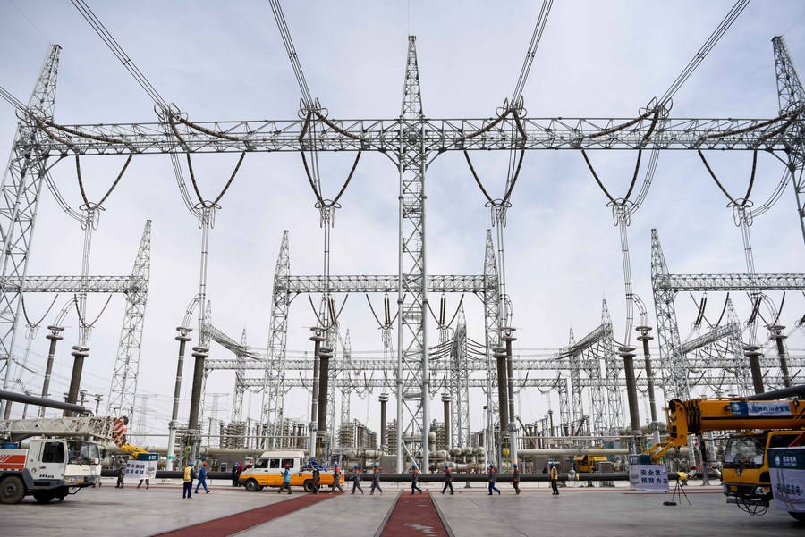 Maintenance staff work at a converter station in Hui Autonomous Prefecture of Changji, northwest China's Xinjiang Uygur Autonomous Region, Oct. 12, 2020.(Xinhua/Ding Lei)