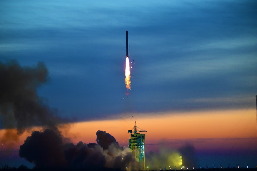 A Long March-4B rocket carrying the satellites Shijian-6 05 blasts off from the Jiuquan Satellite Launch Center in northwest China, Dec. 10, 2021. (Photo by Wang Jiangbo/Xinhua)