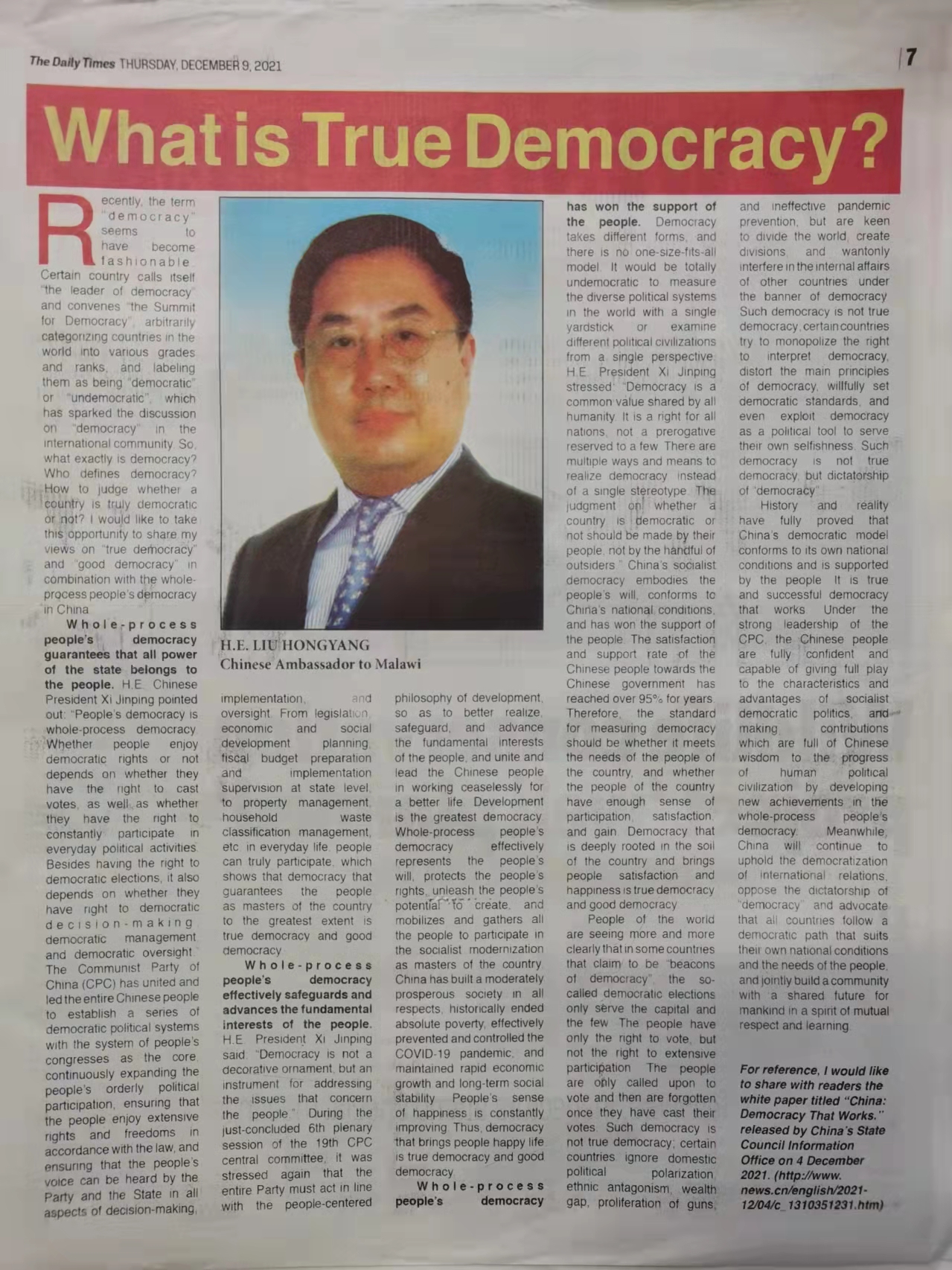On 9 December 2021, an article titled “What is True Democracy” by H.E. Liu Hongyang, the Chinese Ambassador to Malawi, was published on Nation and Daily Times, the leading newspapers in Malawi. Following is the full text of the article: