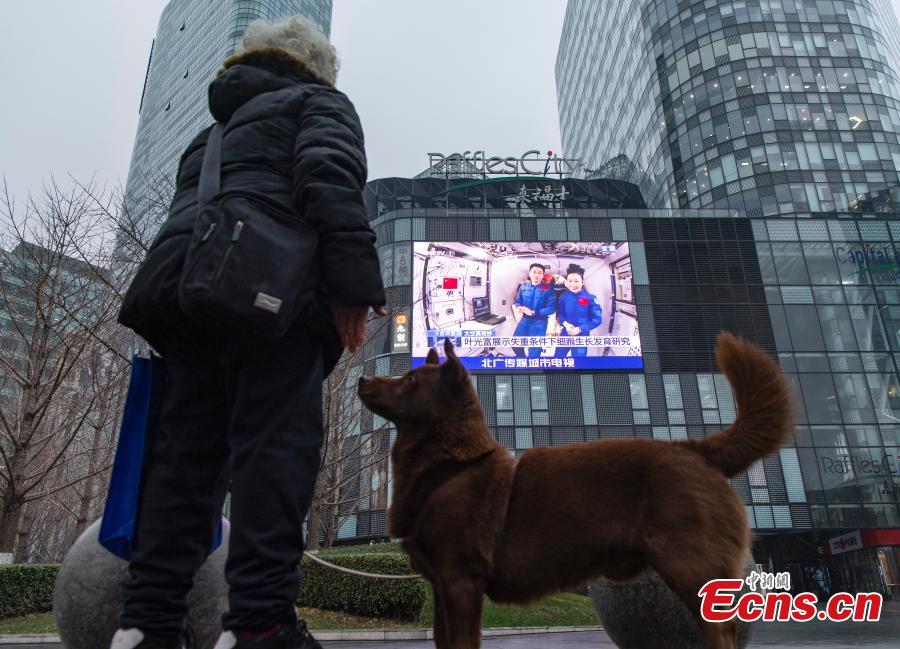 A citizen watches a live class delivered by the Shenzhou-13 crew, in front of an outdoor screen in Dongcheng District, Beijing, Dec. 9, 2021. China's first space class from its space station Tiangong was held on Thursday afternoon, given by Shenzhou-13 crew members Zhai Zhigang, Wang Yaping and Ye Guangfu. (Photo: China News Service/Hou Yu)