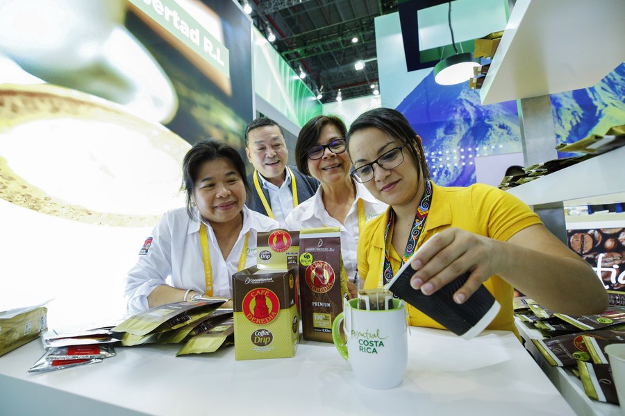 An exhibitor from Costa Rica makes coffee at Food and Agricultural Products exhibition area during the second China International Import Expo (CIIE) in Shanghai, east China, Nov. 9, 2019. (Xinhua/Zhang Yuwei)