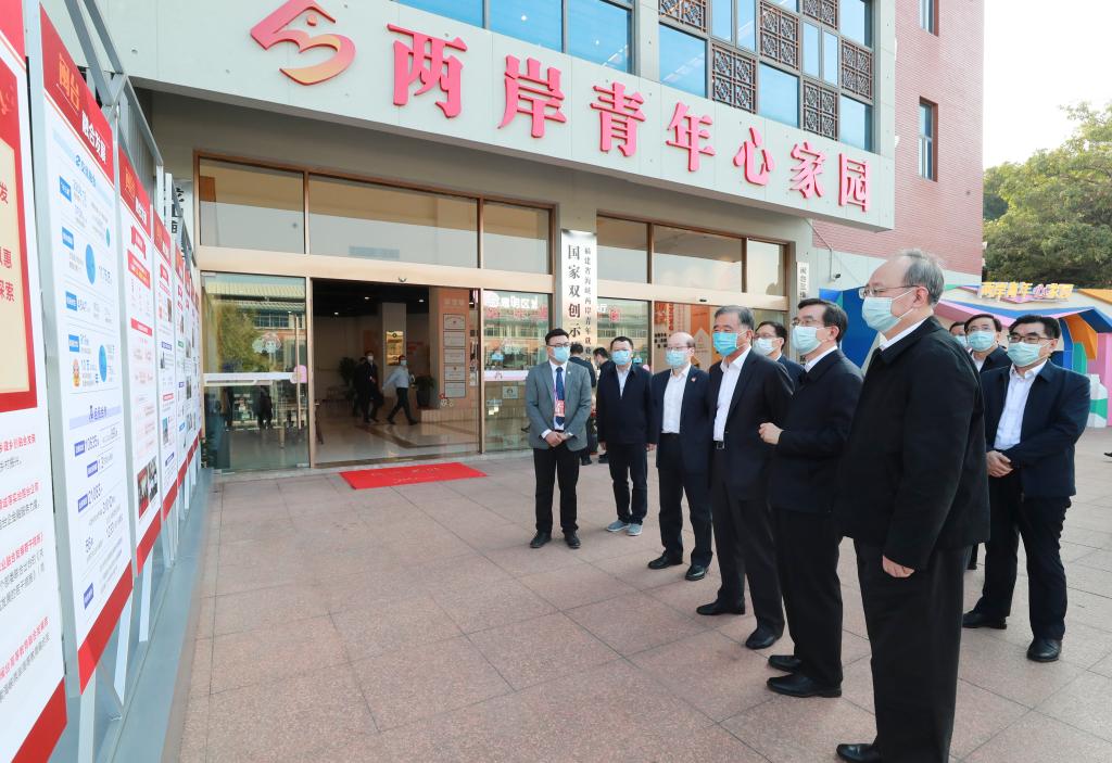Wang Yang, a member of the Standing Committee of the Political Bureau of the Communist Party of China Central Committee and chairman of the National Committee of the Chinese People's Political Consultative Conference, visits an urban community dedicated to youth from across the Strait in Xiamen, southeast China's Fujian Province, Dec. 11, 2021. Wang attended and addressed the 13th Straits Forum held in the coastal city of Xiamen on Saturday. During his stay in Fujian, Wang also visited an urban community in Xiamen dedicated to youth from across the Strait, a religious site, and an enterprise to better understand the cross-Strait exchanges and cooperation. (Xinhua/Ding Lin)