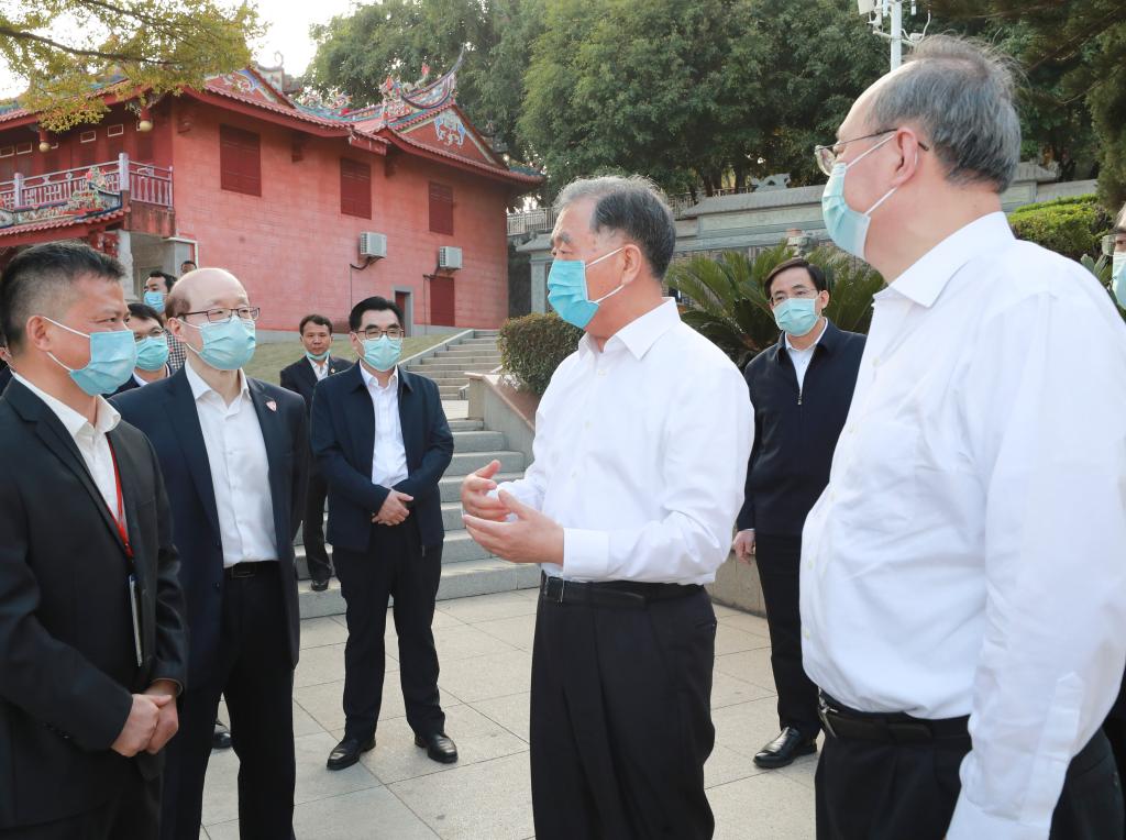 Wang Yang, a member of the Standing Committee of the Political Bureau of the Communist Party of China Central Committee and chairman of the National Committee of the Chinese People's Political Consultative Conference, visits a religious site in Xiamen, southeast China's Fujian Province, Dec. 11, 2021. Wang attended and addressed the 13th Straits Forum held in the coastal city of Xiamen on Saturday. During his stay in Fujian, Wang also visited an urban community in Xiamen dedicated to youth from across the Strait, a religious site, and an enterprise to better understand the cross-Strait exchanges and cooperation. (Xinhua/Ding Lin)