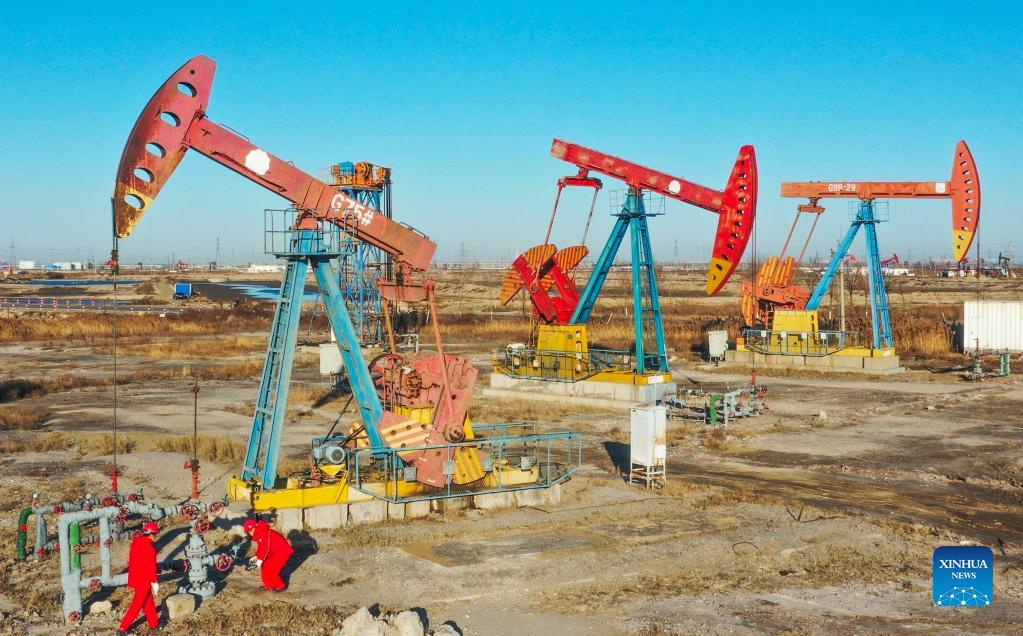 Aerial photo taken on Dec. 12, 2021 shows workers inspecting an oil well at Jidong Oilfield in north China's Hebei Province. Since entering winter, workers at Jidong Oilfield have overcome the unfavorable factors of winter production and strengthened daily inspection to ensure the completion of annual production targets. (Photo by Liu Mancang/Xinhua)