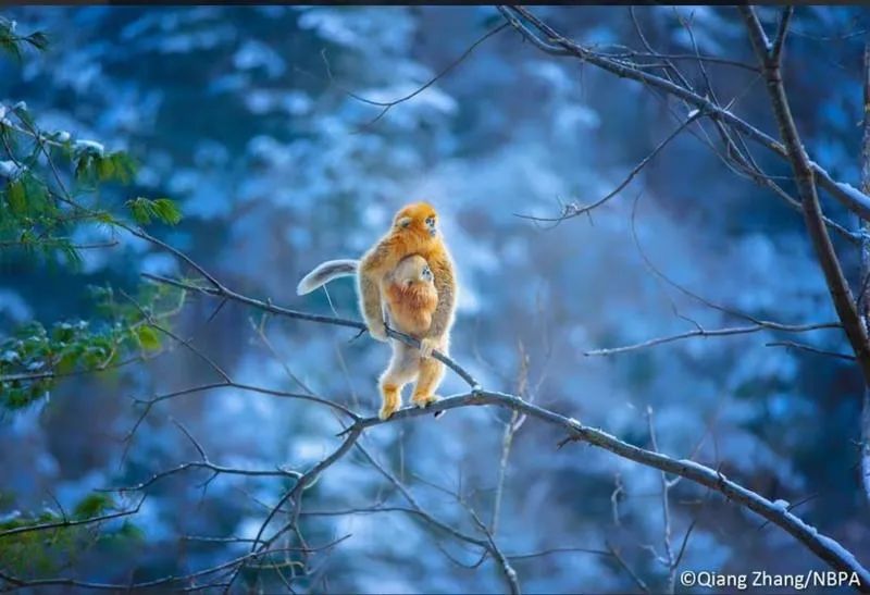 The photographer, Zhang Qiang, received the honor for capturing a young Sichuan snub-nosed monkey in the warm embrace of its mother in the woods of the Qinling Mountains, Shaanxi province.