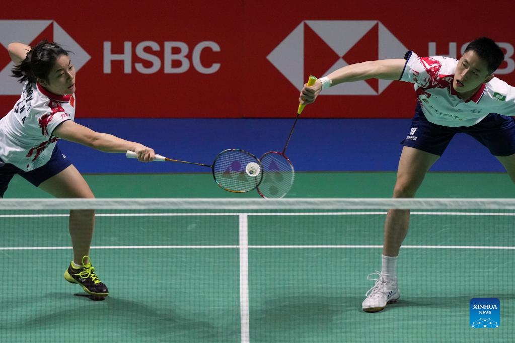 Ou Xuanyi (R)/Feng Xueying of China compete in the mixed doubles first round match against Niclas Nohr/Amalie Magelund of Denmark at the BWF World Championships 2021 in Huelva, Spain, Dec. 12, 2021. (Xinhua/Meng Dingbo)