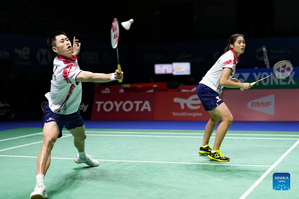 Ou Xuanyi (L)/Feng Xueying of China compete in the mixed doubles first round match against Niclas Nohr/Amalie Magelund of Denmark at the BWF World Championships 2021 in Huelva, Spain, Dec. 12, 2021. (Xinhua/Zhang Cheng)