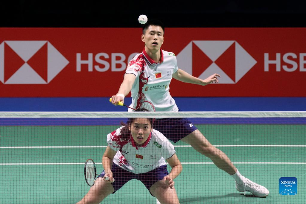 Ou Xuanyi (top)/Feng Xueying of China compete in the mixed doubles first round match against Niclas Nohr/Amalie Magelund of Denmark at the BWF World Championships 2021 in Huelva, Spain, Dec. 12, 2021. (Xinhua/Meng Dingbo)