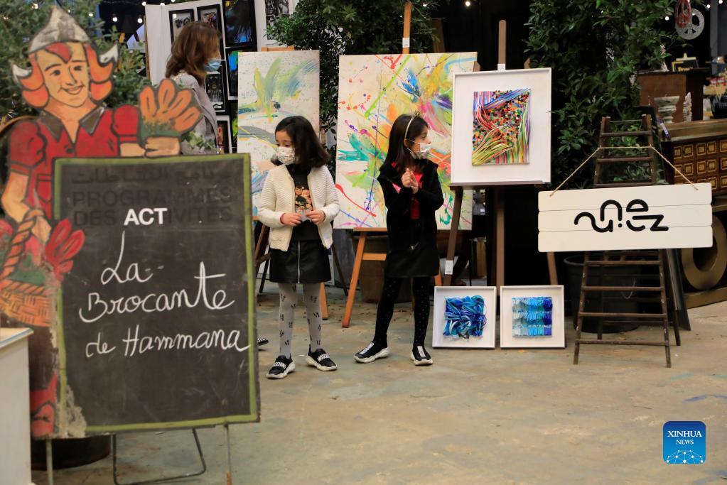 Children look at paintings at an exhibition dubbed "Flea Market" in Beirut, Lebanon, on Dec. 11, 2021. The five-day exhibition from Wednesday displays items including furniture, household appliances, paintings, clothes, accessories, among others. (Xinhua/Liu Zongya)