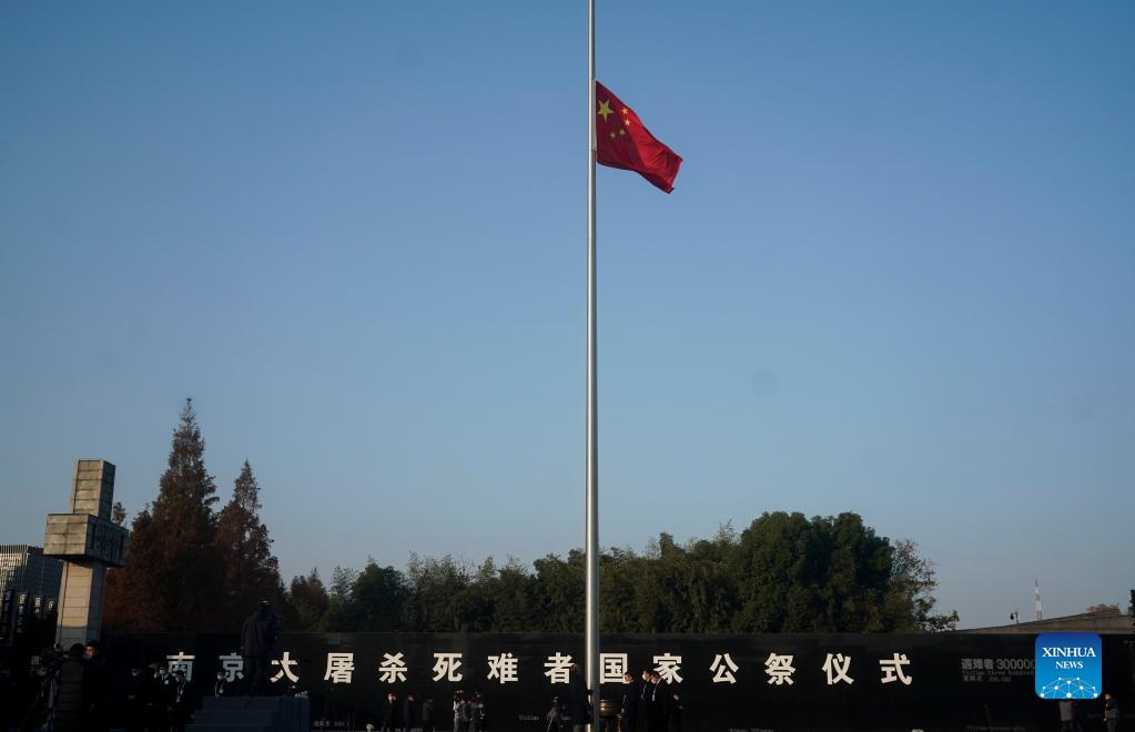 China's national flag flies at half mast ahead of the national memorial ceremony for the Nanjing Massacre victims at the Memorial Hall of the Victims of the Nanjing Massacre by Japanese Invaders in Nanjing, capital of east China's Jiangsu Province, Dec. 13, 2021. (Xinhua/Ji Chunpeng)