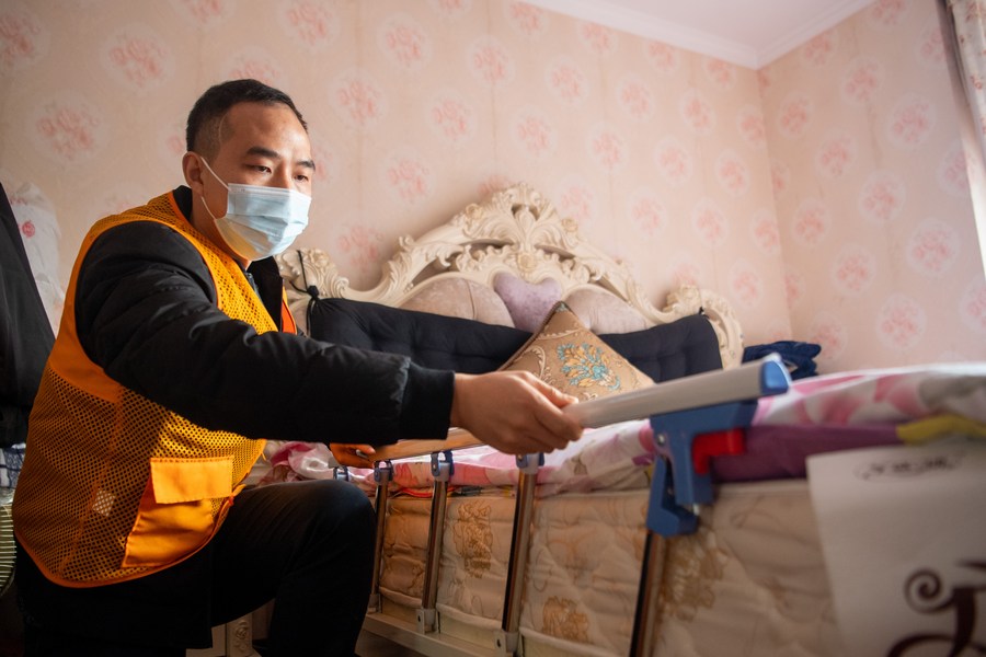 A staff member checks a bed handle for the elderly in Chongqing, southwest China, Dec. 2, 2021. (Xinhua/Tang Yi)
