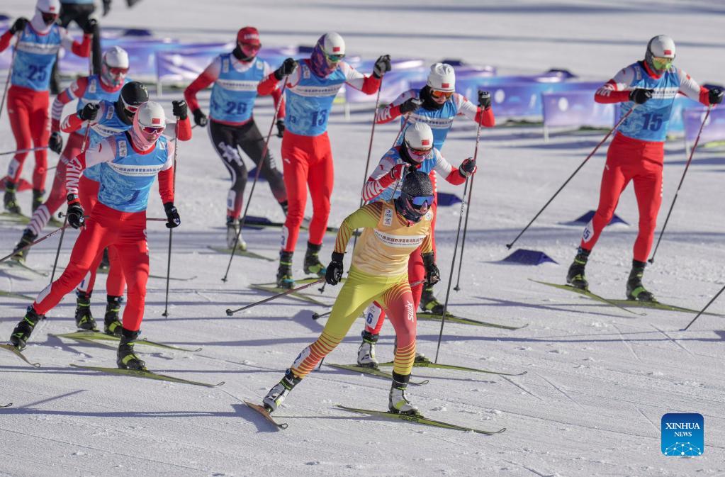 Athletes of Chinese national cross-country skiing team compete during an intra-team simulation competition preparing for the Beijing 2022 Olympic Winter Games in Zhangjiakou City, north China's Hebei Province, on Dec. 12, 2021. (Xinhua/Hu Huhu)