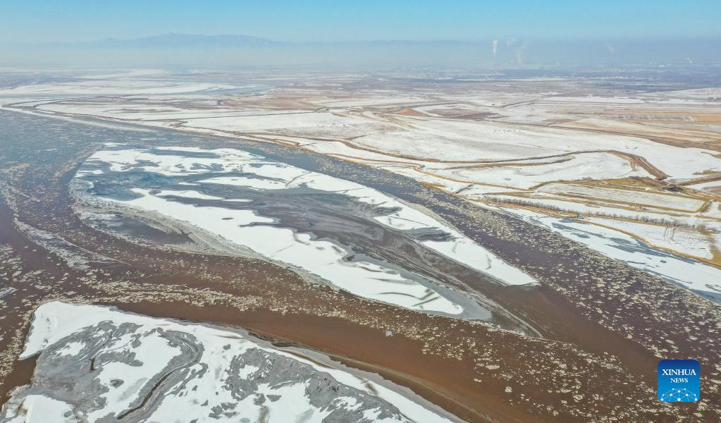 Aerial photo taken on Dec. 13, 2021 shows flowing ice on the Yellow River in Ordos, north China's Inner Mongolia Autonomous Region. (Xinhua/Lian Zhen)