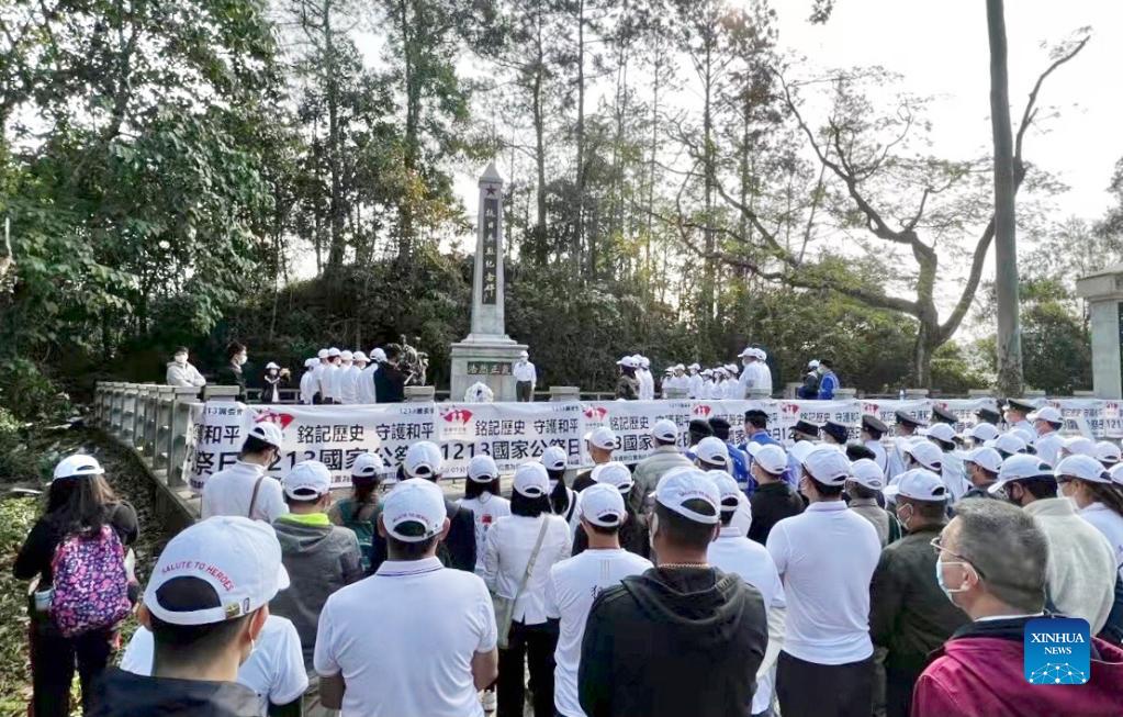 People take part in a memorial ceremony to mourn the victims of the Nanjing Massacre on the occasion of the eighth National Memorial Day in Hong Kong, south China, Dec. 13, 2021. The Nanjing Massacre took place after the Japanese troops captured the city on Dec. 13, 1937. Over six weeks, they killed about 300,000 Chinese civilians and unarmed soldiers in one of the most barbaric episodes of World War II. (Xinhua)