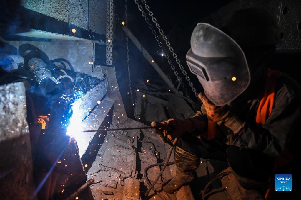 A worker carries out welding operation at the construction site of the Wang'an Tunnel of the high-speed railway linking Nanning and Yulin of south China's Guangxi Zhuang Autonomous Region, Dec. 13, 2021. The Wang'an tunnel, a key project for the Nanning-Yulin high-speed railway, was drilled through on Monday. With a designed speed of 350 km per hour, the Nanning-Yulin high-speed railway is a crucial part of the high-speed railway linking Nanning of Guangxi Zhuang Autonomous Region and Shenzhen of Guangdong Province. (Xinhua/Cao Yiming)