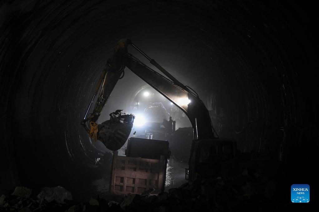An excavator is seen working at the construction site of the Wang'an Tunnel of the high-speed railway linking Nanning and Yulin of south China's Guangxi Zhuang Autonomous Region, Dec. 13, 2021. The Wang'an tunnel, a critical control project for the Nanning-Yulin high-speed railway, was drilled through on Monday. With a designed speed of 350 km per hour, the Nanning-Yulin high-speed railway is a crucial part of the high-speed railway linking Nanning of Guangxi Zhuang Autonomous Region and Shenzhen of Guangdong Province. (Xinhua/Cao Yiming)