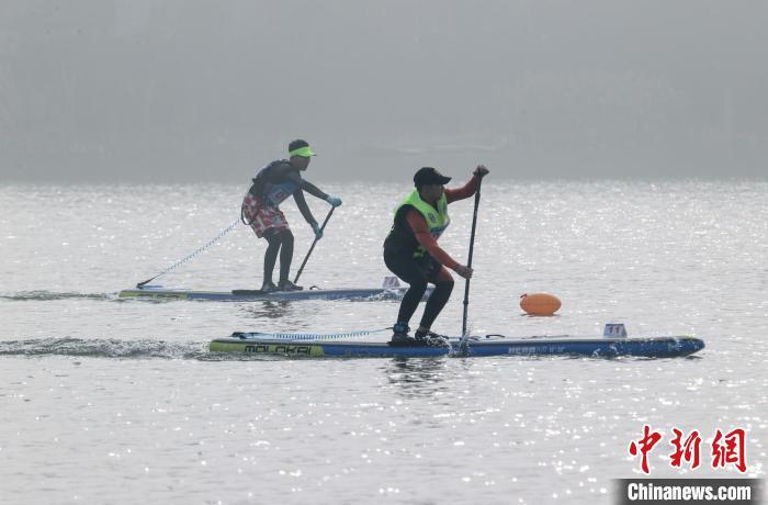 Competitors steer their stand-up paddle (SUP) boards at an intense race on the Donghu Lake in Wuhan, central China's Hubei Province, Dec 13, 2021. (China News Service/Zhang Chang)