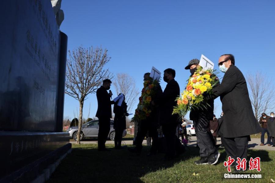 Representatives of Chinese community in Toronto present flowers to mourn Nanjing Massacre victims at the Nanjing Massacre Victims Memorial in Toronto, Canada, Dec. 13, 2021. (China News Service/Yu Ruidong)