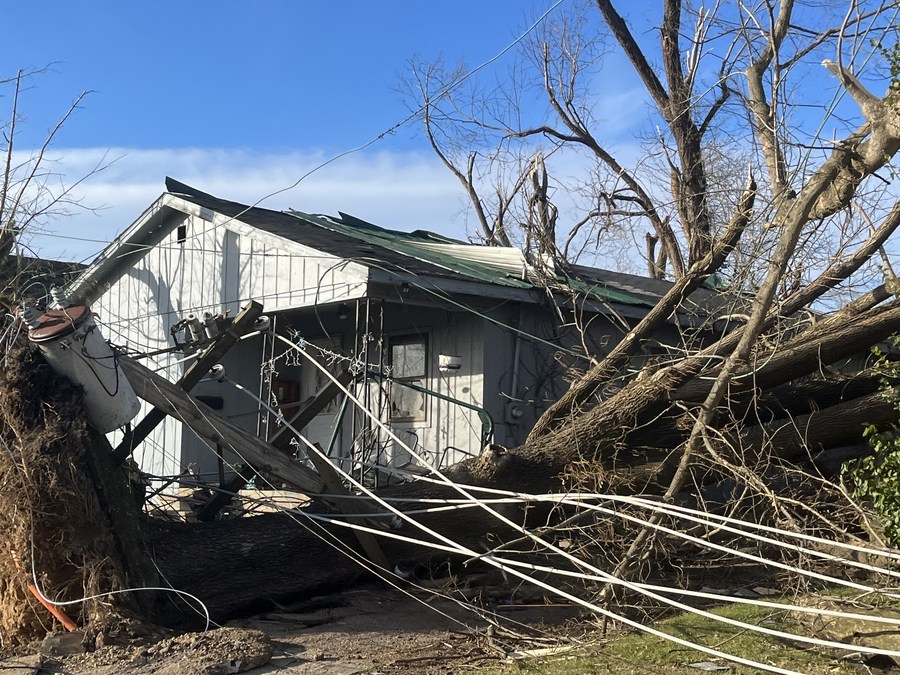 Photo taken on Dec. 11, 2021 shows a tree toppled in tornadoes in Mayfield, Kentucky, the United States. (Photo by Caromirna Sanchez/Xinhua)