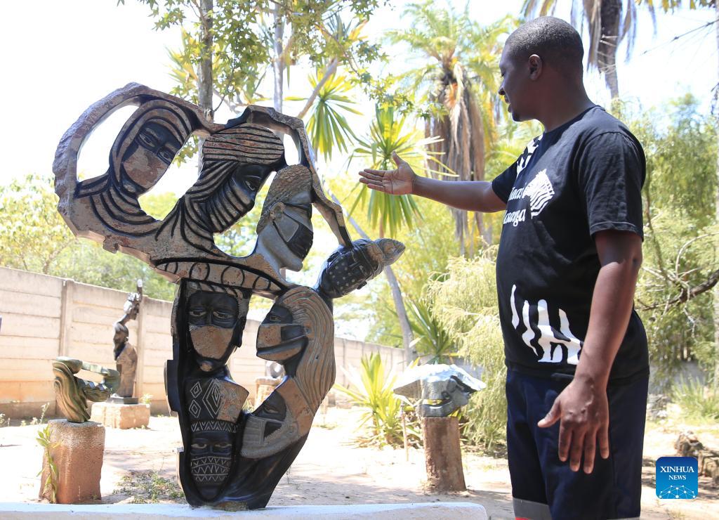 A piece of artwork made by David Ngwerume, one of Zimbabwe's most decorated artists, who is known for his pandemic-inspired art, is seen at his studio in Harare, Zimbabwe, Dec. 9, 2021. Two of Zimbabwe's renowned stone sculptors will showcase their talent at the 9th Beijing International Art Biennale which will start next month. The Beijing International Art Biennale, which has taken place since 2002, promotes global harmony through contemporary artwork exhibitions. (Photo by Shaun Jusa/Xinhua)