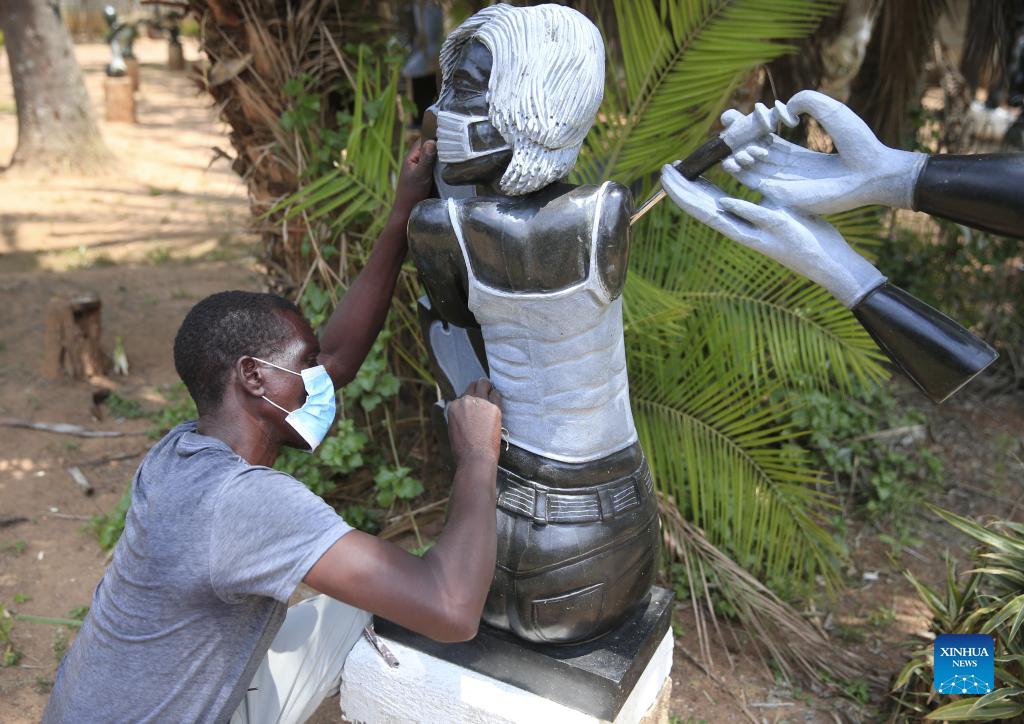 A worker polishes the sculpture titled "Into the third wave" made by David Ngwerume, one of Zimbabwe's most decorated artists, who is known for his pandemic-inspired art, in Harare, Zimbabwe, Dec. 8, 2021. Two of Zimbabwe's renowned stone sculptors will showcase their talent at the 9th Beijing International Art Biennale which will start next month. The Beijing International Art Biennale, which has taken place since 2002, promotes global harmony through contemporary artwork exhibitions. (Photo by Shaun Jusa/Xinhua)