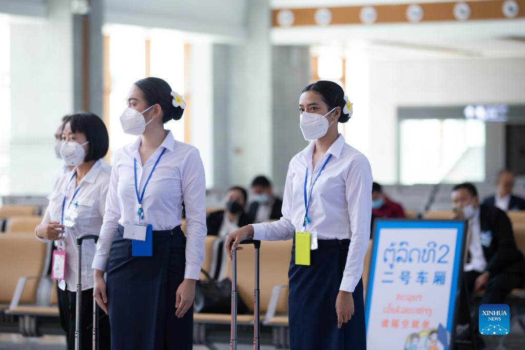 Lao railway staff welcome passengers of the China-Laos Railway at Vientiane Railway Station in Vientiane, Laos, Dec. 3, 2021. The China-Laos Railway created more than 110,000 jobs for Lao people during its construction. Since the railway's construction was launched, the project has drawn the interest of numerous local young talents who pursued their professional career on the railway, and many of them have grown into railway engineering masters. (Photo by Kaikeo Saiyasane/Xinhua)