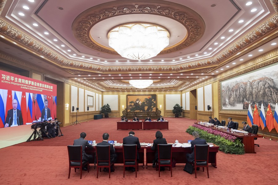 BEIJING, Dec. 15 (Xinhua) -- Chinese President Xi Jinping and Russian President Vladimir Putin held a video meeting on Wednesday, as they praised "model" China-Russia relations and pledged to cooperate more on safeguarding the two countries' core interests and upholding international fairness and justice.