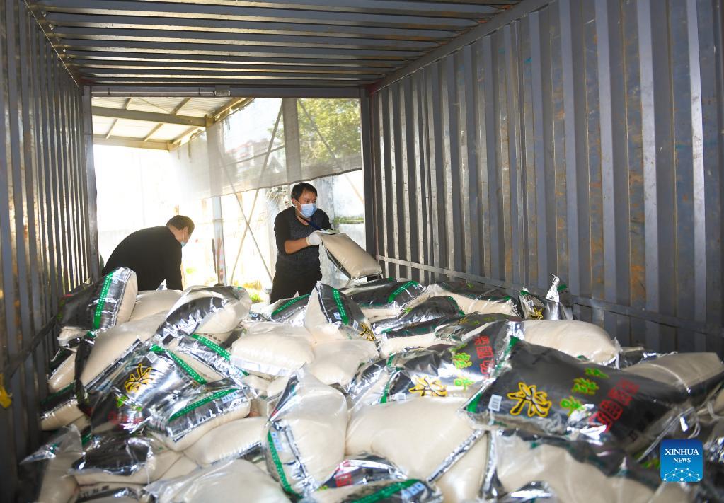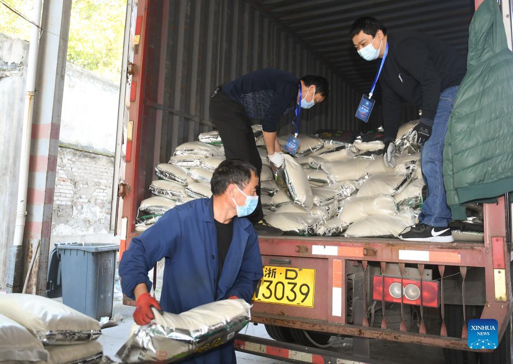 Staff members transfer rice to be delivered in Shangyu District of Shaoxing City, east China's Zhejiang Province, Dec. 15, 2021. Shangyu District of Shaoxing has taken measures to ensure the supply of daily necessities for residents following a recent COVID-19 resurgence. (Xinhua/Weng Xinyang)