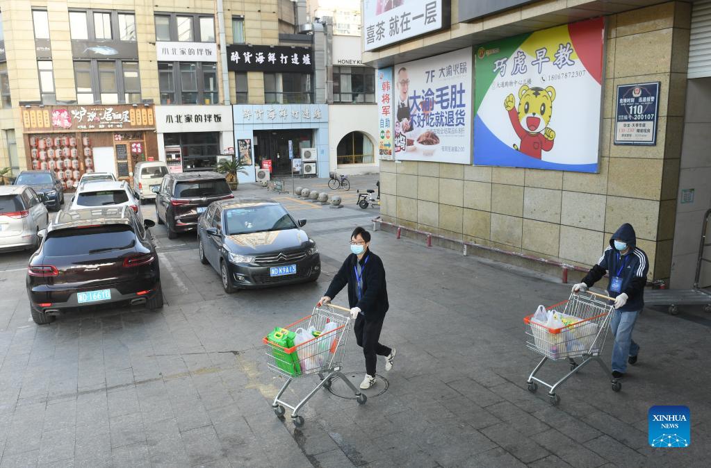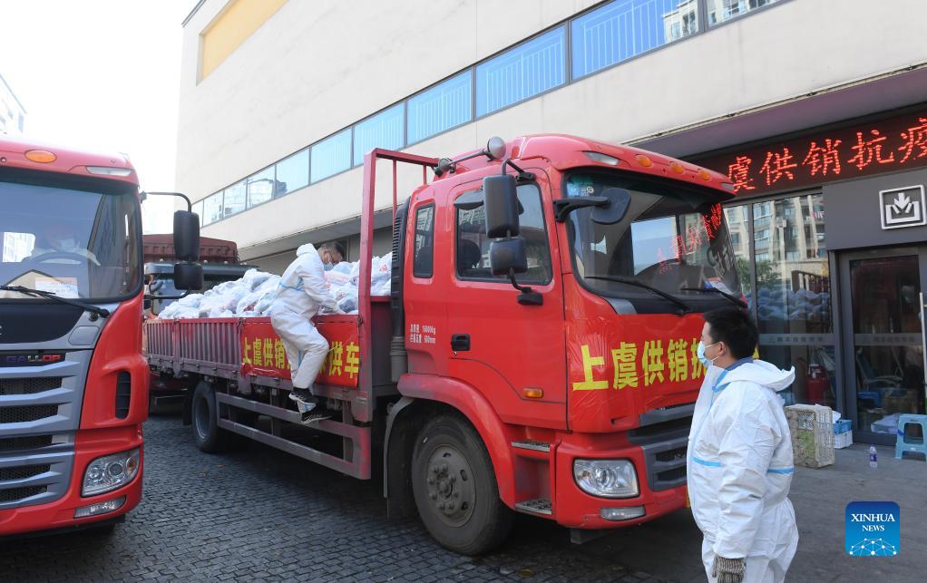Staff members deliver daily necessities to nearby communities in Shangyu District of Shaoxing City, east China's Zhejiang Province, Dec. 15, 2021. Shangyu District of Shaoxing has taken measures to ensure the supply of daily necessities for residents following a recent COVID-19 resurgence. (Xinhua/Weng Xinyang)