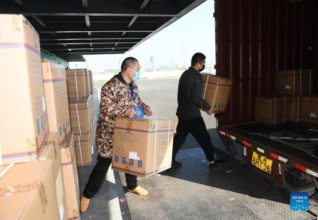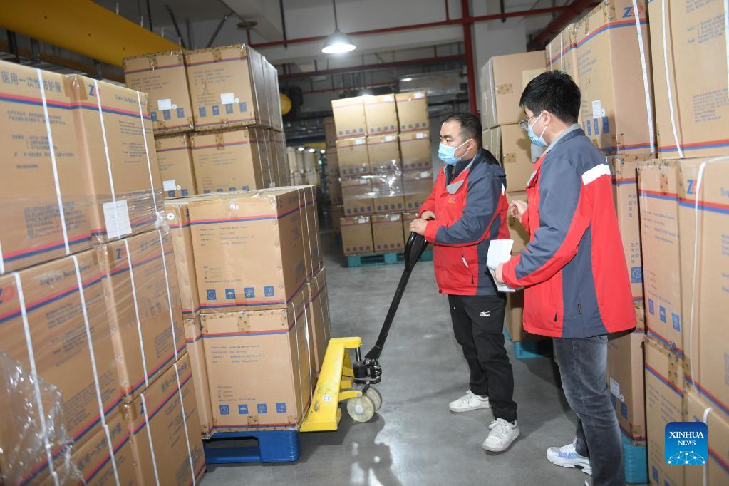 Staff members transfer epidemic prevention materials in Shangyu District of Shaoxing City, east China's Zhejiang Province, Dec. 15, 2021. Shangyu District of Shaoxing has taken measures to ensure the supply of daily necessities for residents following a recent COVID-19 resurgence. (Xinhua/Weng Xinyang)