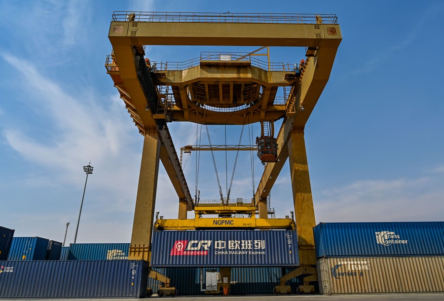 A crane loads containers at the Manzhouli Railway Station in Manzhouli, a land port on the China-Russia border, north China's Inner Mongolia Autonomous Region, April 13, 2020. (Xinhua/Yu Jia)